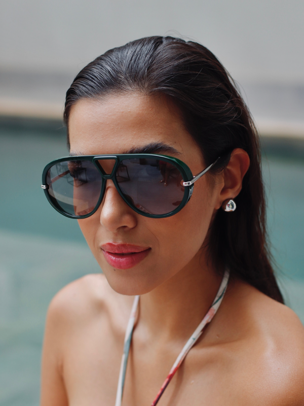 Çerçeve, geri dönüştürülmüş asetat ön yüz ve metal sap kombinasyonuyla hem sürdürülebilirlik hem de dayanıklılık odağında tasarlanmıştır. Gri, mat/soft finish efektli UV400 camlar, yoğun güneş ışığında UVA ve UVB ışınlarına karşı tam koruma sağlayan güçlü bir filtre sunar. Gri tonlu lensler, parlama ve göz kamaşmasını azaltırken renk algısını nötr tutarak doğal bir görüş deneyimi sağlar. UV400 filtreli bu damla form camlar, özellikle şehir içi kullanım, seyahat ve açık hava aktivitelerinde hem göz sağlığını koruyan hem de şık görünen lüks güneş gözlüğü performansı sunar.