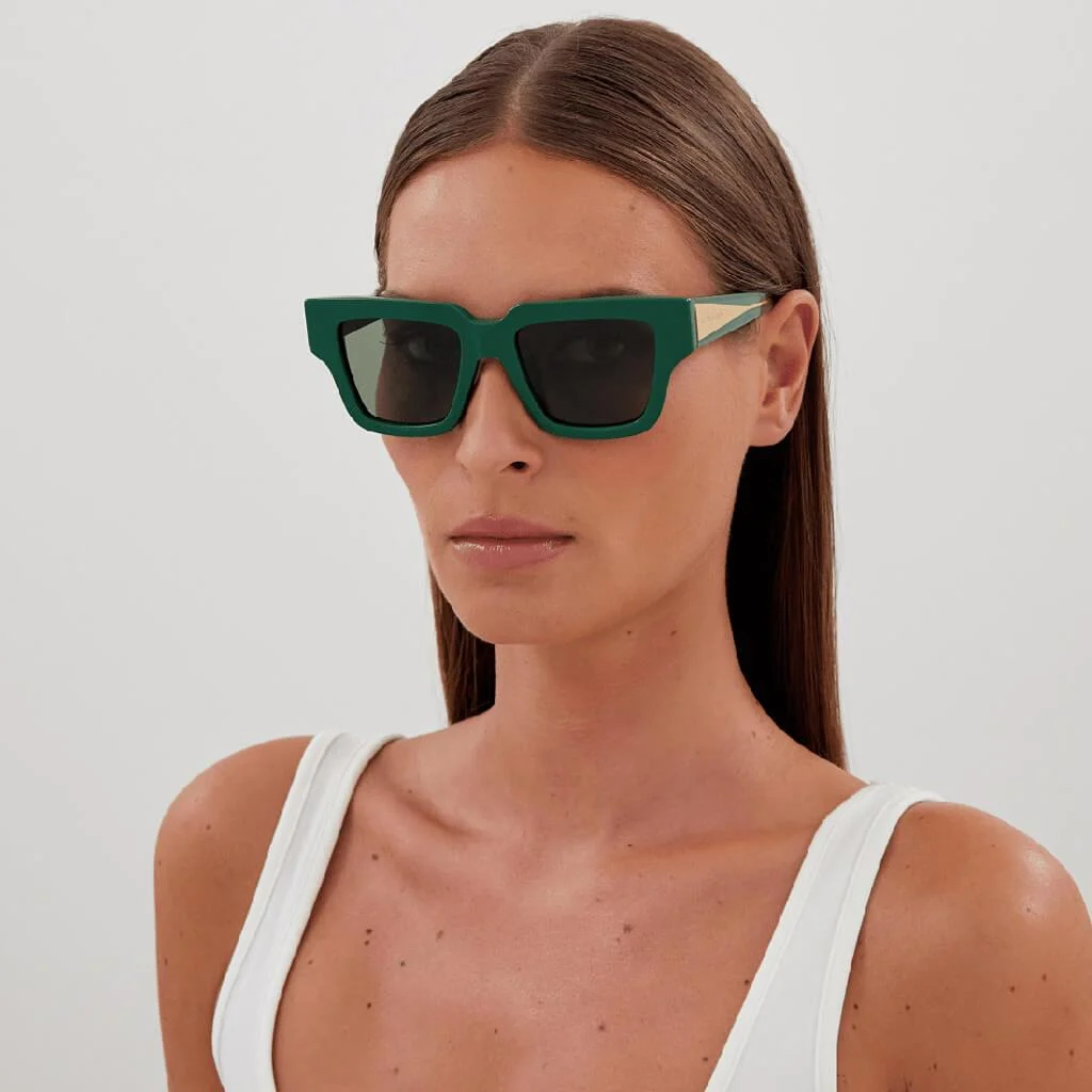 BV1276S 003 modeli, tamamen geri dönüştürülmüş asetat (recycled acetate) malzemeden üretilmiş tam çerçeveli dikdörtgen/kare formda bir güneş gözlüğüdür. 52 mm cam genişliği, 19 mm burun köprüsü ve 145 mm sap uzunluğu ile 52?19?145 ölçülerine sahiptir; bu oranlar, kadınlar için medium beden kategorisinde dengeli bir fit sunar. Shiny dark green çerçeve, düz üst hat ve yumuşak köşeli kare lens yapısıyla yüzü aşırı kaplamadan belirgin ve mimari bir siluet oluşturur. Asetat burun formu ve dengeli sap kalınlığı, günlük kullanımda çerçevenin kaymasını azaltarak stabil bir oturuş sağlar.