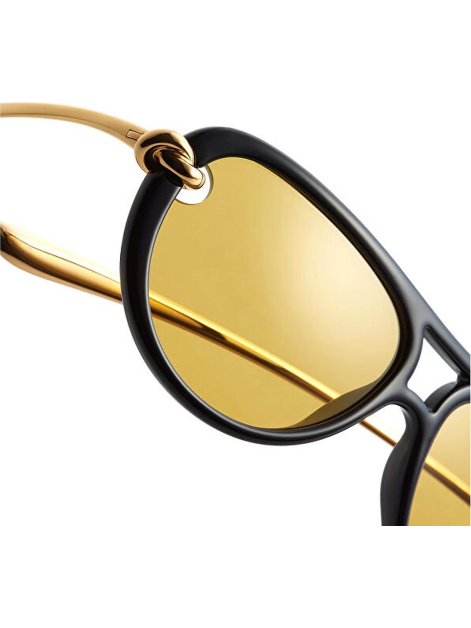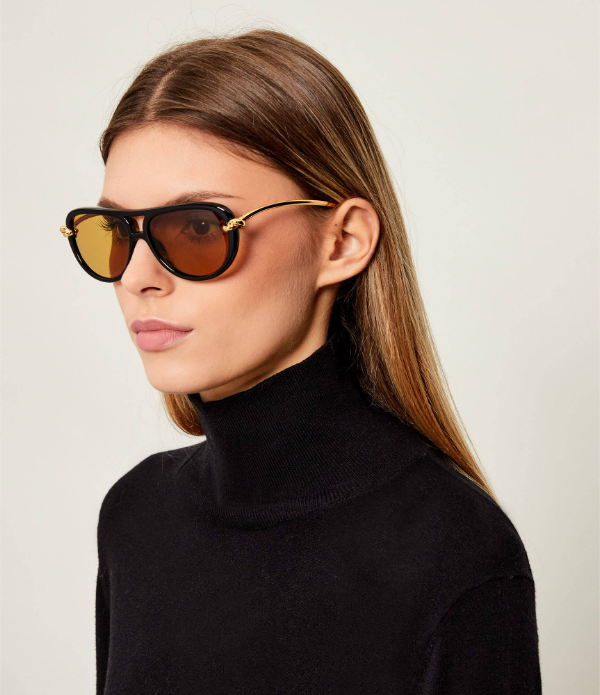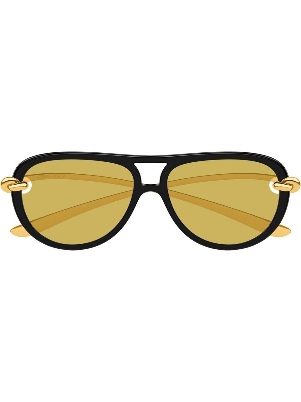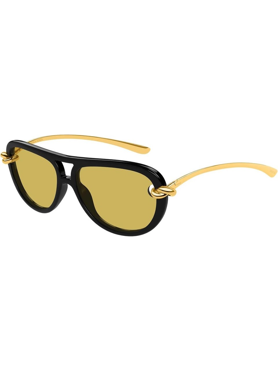 Bottega Veneta BV1418S 001: Parlak Siyah Knot Aviator Form ve Sarı UV Filtreli Organik Cam