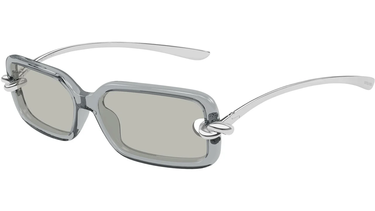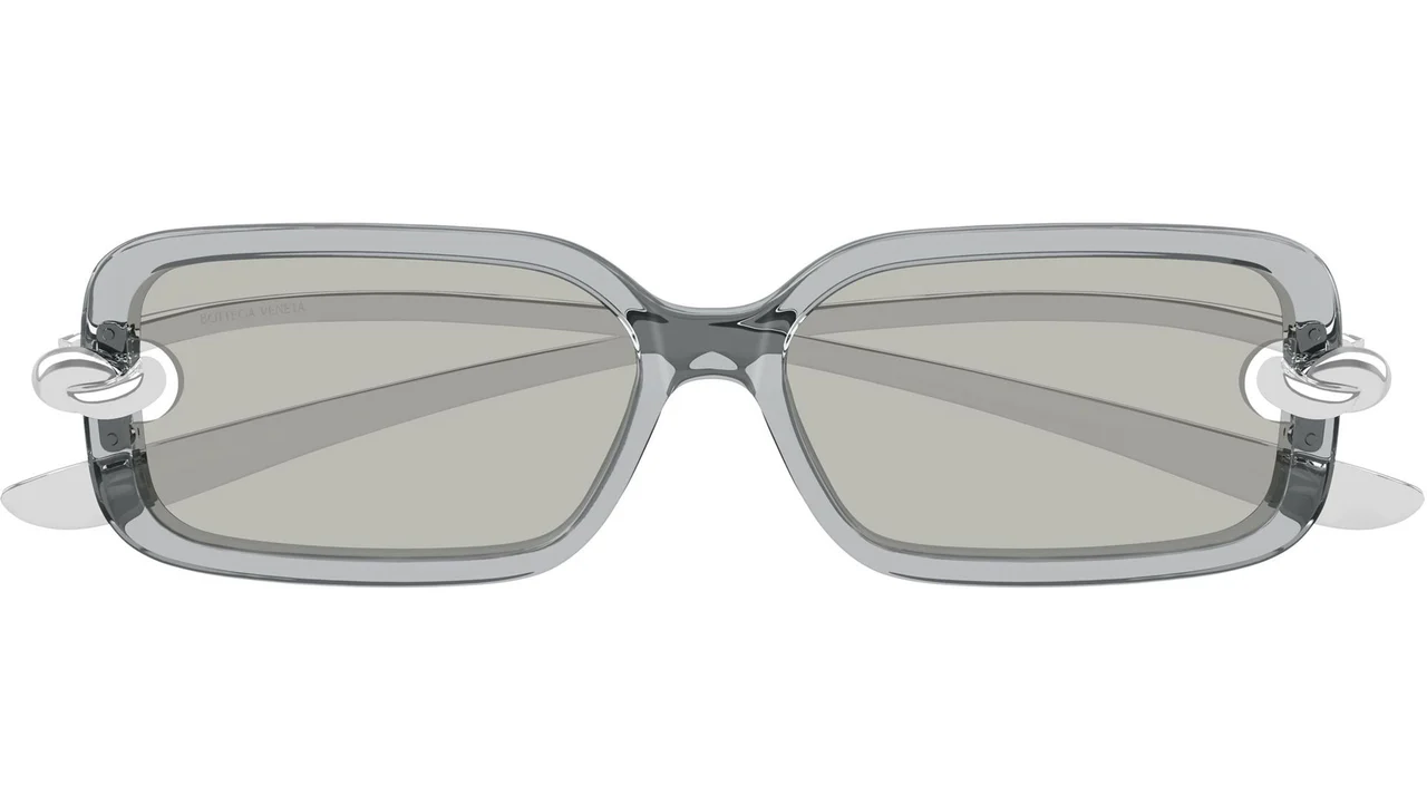Bottega Veneta BV1439S 004: Markanın "Signature Icons" serisinin en çarpıcı parçalarından biri olan bu model, 004 renk koduyla şeffaf grinin futuristik duruşunu gümüş metal detaylarla birleştirir. Dikdörtgen (rectangle) formunu Bottega Veneta’nın ikonik "Knot" (Düğüm) motifiyle menteşelere taşıyan bu kadın güneş gözlüğü, minimalizmi lüksün en rafine noktasıyla buluşturur. Görselde de görüleceği üzere, şeffaf asetatın içinden geçen ışık, çerçeveye neredeyse maddesiz ve heykelsi bir optik derinlik katar. Teknik Tasarım ve Ölçüler