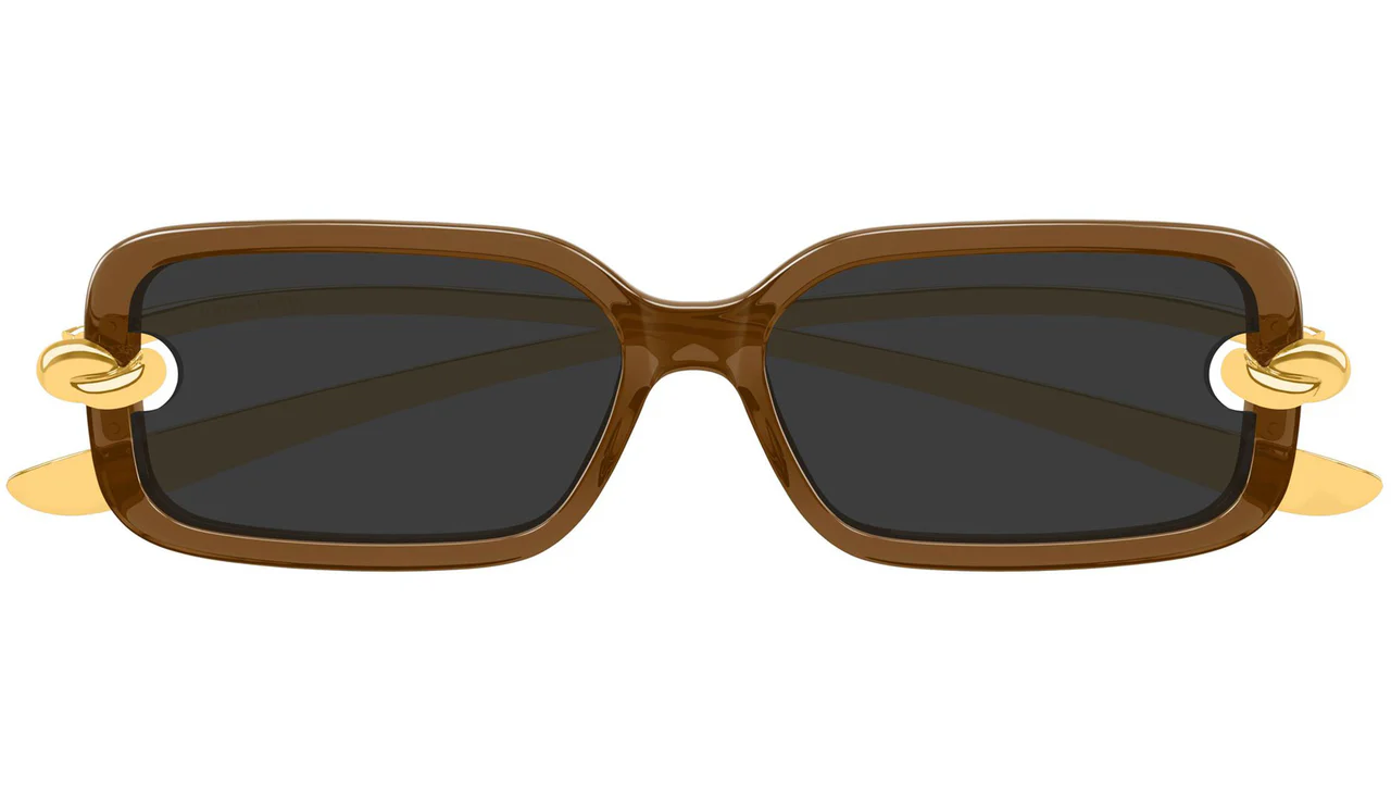 Bottega Veneta BV1439S 005: Markanın "Signature Icons" koleksiyonuna ait olan bu model, 005 renk koduyla sıcak karamel tonlarının derinliğini ve altın metal detayların ışıltısını bir araya getirir. Dikdörtgen (rectangle) formunu Bottega Veneta’nın ikonik "Knot" (Düğüm) motifiyle saplara taşıyan bu kadın güneş gözlüğü, minimalizmi lüksün en üst noktasıyla buluşturur. Görselde de görüleceği üzere, şeffaf asetatın içinden süzülen altın rengi saplar, çerçeveye mücevherat zarafetinde bir optik derinlik katar. Teknik Tasarım ve Ölçüler