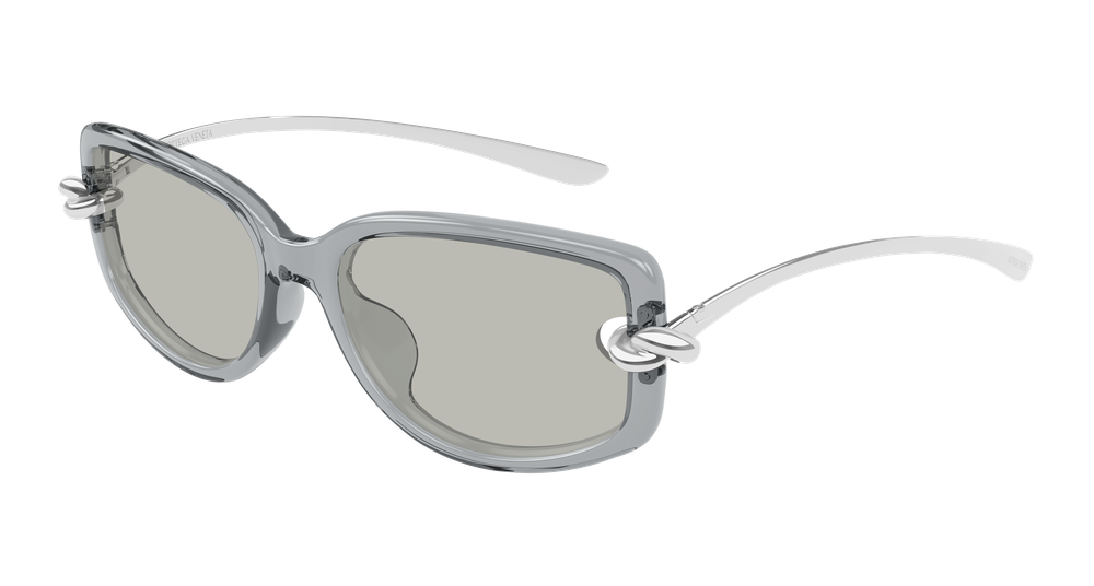 Bottega Veneta BV1440SA 004: Bottega Veneta'nın Knot ailesinin Asian Fit versiyonu olan BV1440SA, 004 Gri/Gümüş kombinasyonunda koleksiyonun en soyut ve en modern yorumunu sunar. Şeffaf gri bio-enjeksiyon reçinenin yarı saydam yapısı ışığı içinden geçirerek çerçeveye neredeyse dematerialized — maddesizleşmiş — bir optik kalite katarken gümüş metalin mat parlaklığı ve ikonik BV düğüm menteşesi bu minimalizmi lüksün en rafine noktasına taşımaktadır.