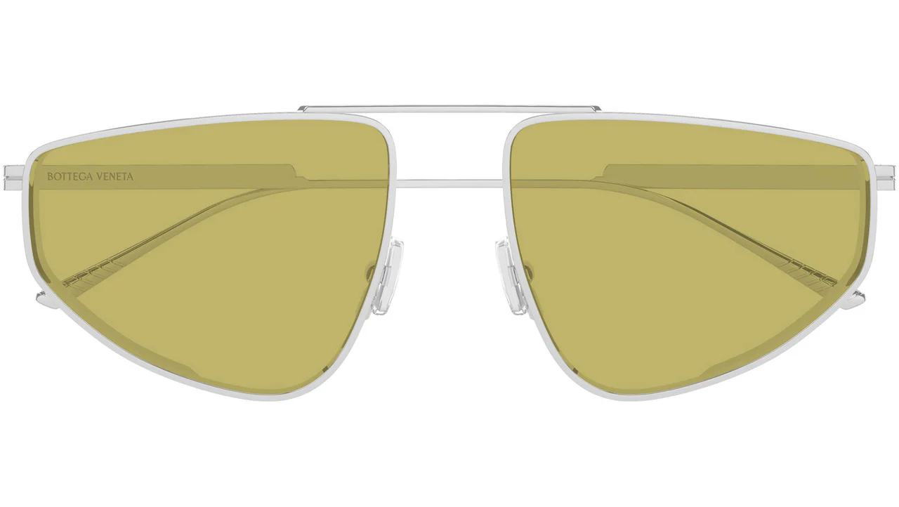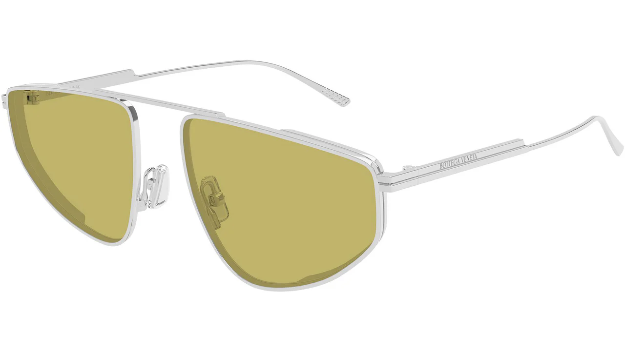 Bottega Veneta BV1466S 003: Markanın "Ribbon" koleksiyonuna ait olan bu model, 003 renk koduyla soğuk gümüş metalin endüstriyel şıklığını, hardal sarısı lenslerin sıcak ve retro enerjisiyle birleştirir. Geleneksel pilot (aviator) formunu daha keskin, geometrik ve "unconventional" (sıra dışı) bir tavırla yeniden yorumlayan bu kadın güneş gözlüğü, Bottega Veneta'nın minimalist lüks anlayışını cesur bir moda beyanına dönüştürür. Sap kısımlarında yer alan karakteristik gümüş şerit (ribbon) detayı, tasarıma markanın imza niteliğindeki rafine dokunuşunu katar. Teknik Tasarım ve Ölçüler