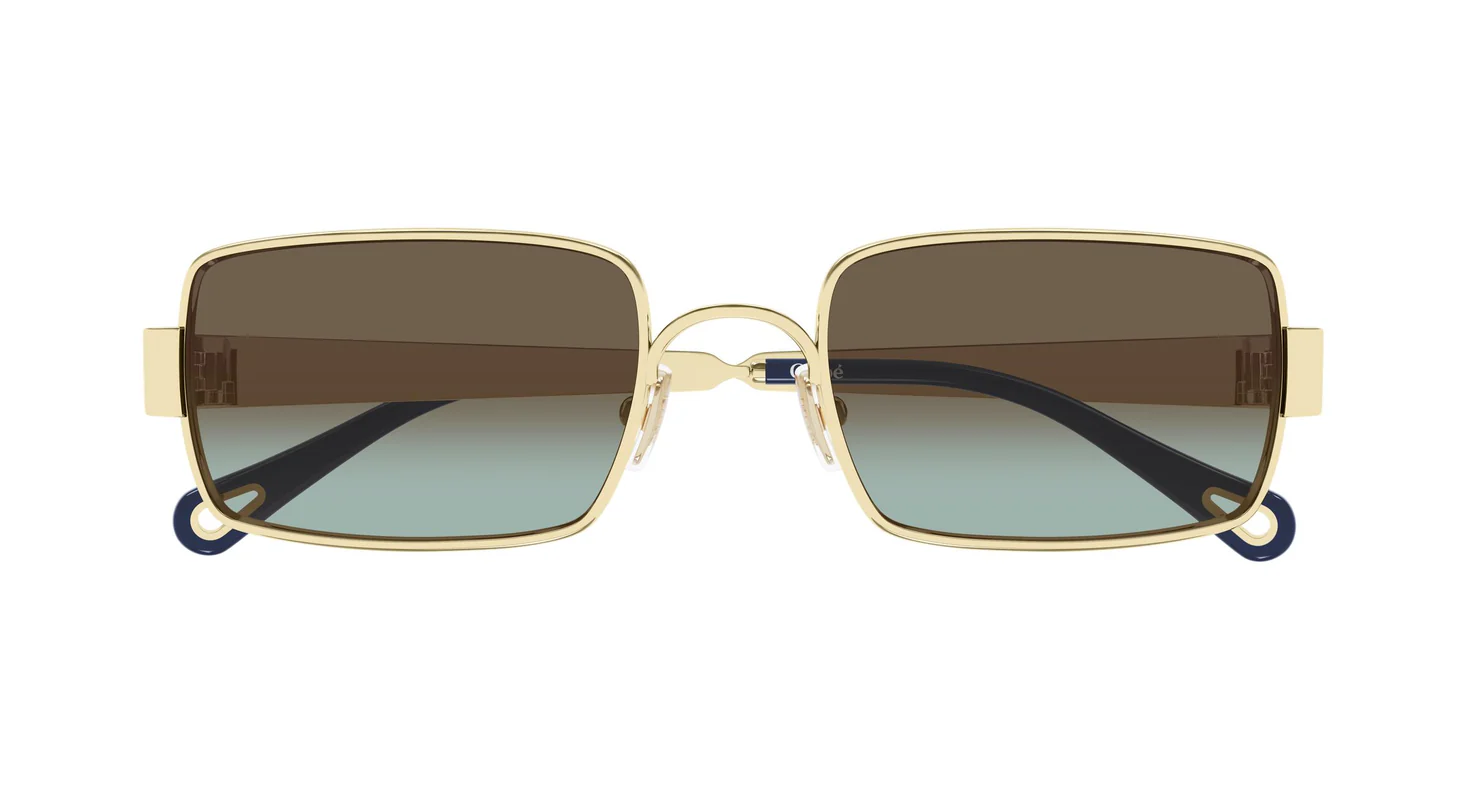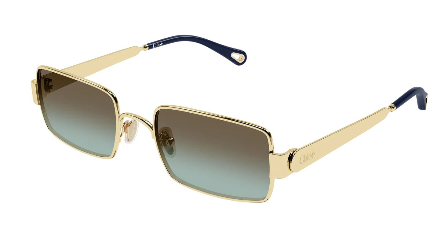 CH0354S 003, 002 renk varyasyonunun lacivert yorumu. Aynı parlak altın metal oversize dikdörtgen gövde, aynı geniş düz şakaklardaki gravürlü "Chloé" yazısı; ancak bu varyasyonda şakak ucu lacivert (navy) asetat teardrop ve lens kahverengi-yeşil çift degrade Bio Nylon. Sonuç: daha serin, daha kozmopolit, Fransız chic'ine yakın bir renk dengesi.