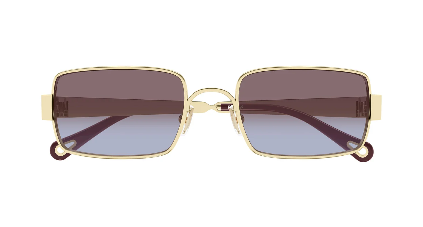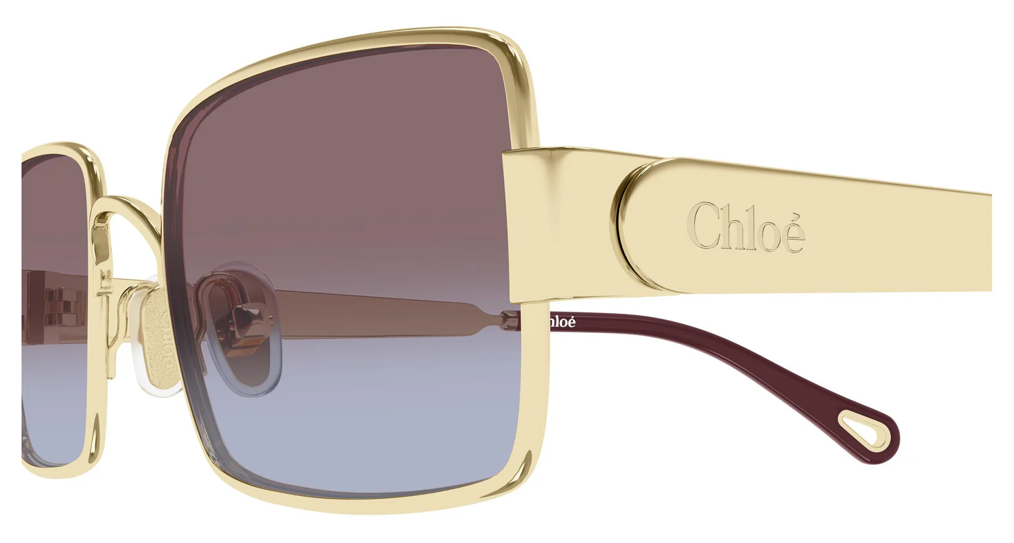 CH0354S 004, aynı oversize altın metal dikdörtgen gövdenin en dramatik renk yorumu. Parlak altın çerçeve ve geniş gravürlü "Chloé" yazılı şakaklar burada bordo (burgundy/şarap kırmızısı) asetat teardrop uç ile buluşuyor; lens ise üstten koyu mor başlayıp alta doğru lavanta-gri/mavi tona geçen mor-gri çift degrade Bio Nylon. Sonuç: altın + bordo + mor — sonbahar ve kış koleksiyonlarını çağrıştıran, sofistike ve iddialı bir renk hikayesi.