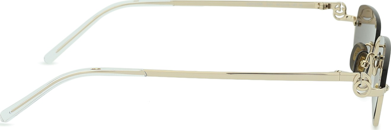 Saplarda yer alan ters yerleştirilmiş GG logosu (interlocking GG upside down), modelin kenarlarında güçlü bir Gucci imzası oluşturur; altın metal kollar, ince ve düz hatlarıyla 90’lar runway estetiğini çağrıştırır. Burun pedi kısmında ayarlanabilir metal pedler kullanılması, çerçevenin farklı yüz şekillerine göre rahatça uyarlanabilmesini sağlar.