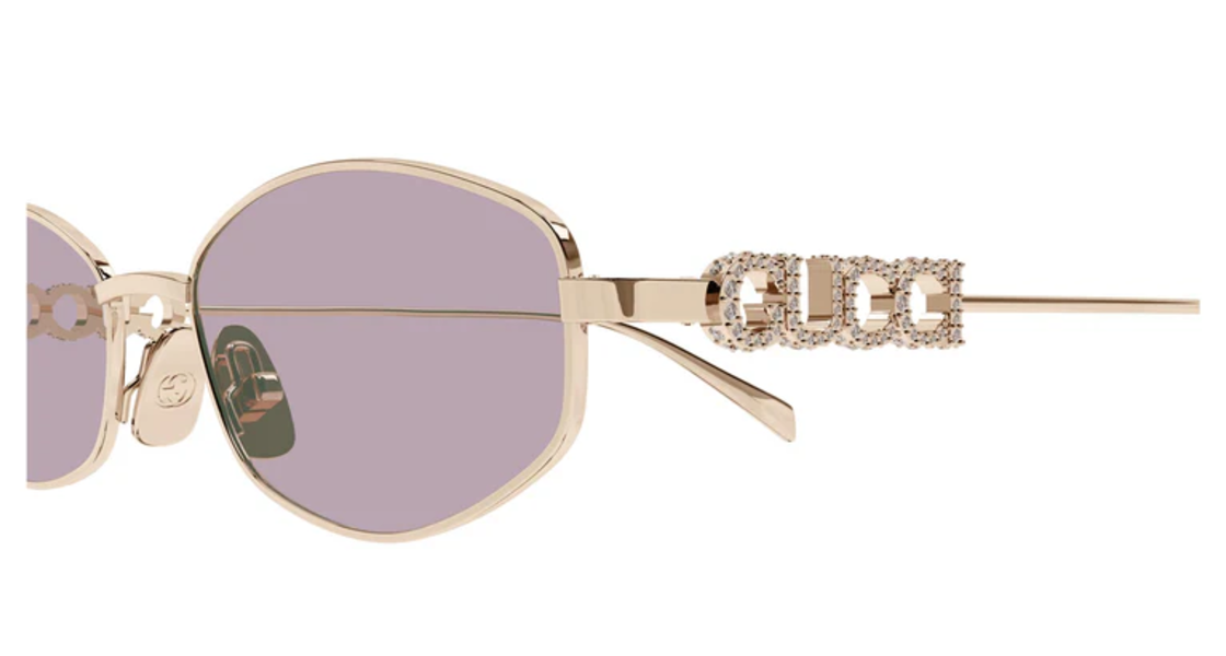 Gucci GG1802S 003 Altın Mor Kadın güneş gözlüğü, Cruise 2025 koleksiyonunun metal Lettering serisinde yer alan, badem (almond) form metal çerçevesiyle modern ve zarif bir lüks güneş gözlüğüdür. Parlak altın ton metal çerçeve ile katı (solid) mor/violet bio-nylon lenslerin kontrastı, hem şehir stiline hem de özel akşam kombinlerine sofistike ve iddialı bir renk vurgusu katar. Badem form, hafif daraltılmış üst?alt hatlarıyla yuvarlak ve oval yüz tiplerini zarif şekilde çerçeveleyerek feminen bir siluet oluşturur. Saplarda kabartmalı/3D Gucci lettering logosu, ince metal yapı üzerinde mücevher etkisi yaratan karakteristik bir marka imzası sunar.