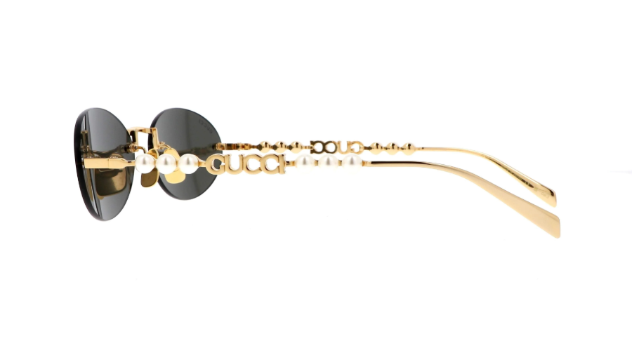 Gucci GG1922S 001 Altın Gri Kadın güneş gözlüğü, glasant (delikli) badem/oval forma sahip son derece zarif ve feminen bir lüks güneş gözlüğüdür. Parlak altın ton metal çerçeve, ince yapısı ve gövdedeki kalp/Gucci gravür detaylarıyla yüzü çerçeveleyen hafif ve sofistike bir siluet sunar. Saplarda yer alan kesik Gucci logosu etrafına dizilmiş inci benzeri süsler, modeli takı etkisinde bir aksesuar hâline getirir. Gri solid lenslerle kombinlenen altın metal yapı, klasik ve şık şehir stilini tamamlayan zarif bir Gucci güneş gözlüğü yorumu oluşturur.