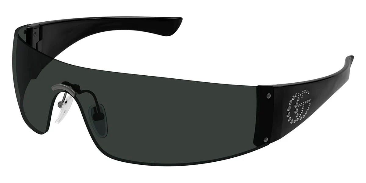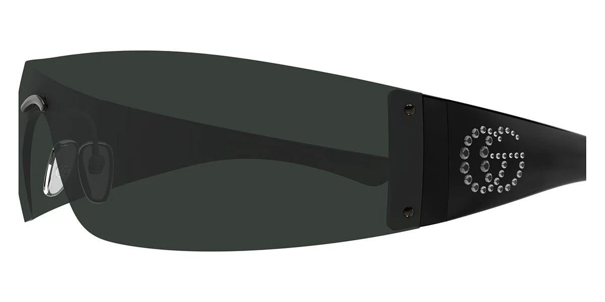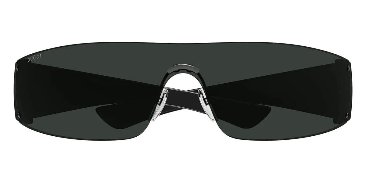 Gucci GG1958S 001, rutenyum (gunmetal) metal gövde ve gri shield (tek parça) camlı, sportif-lüks bir maske formu sunan unisex bir modeldir.
