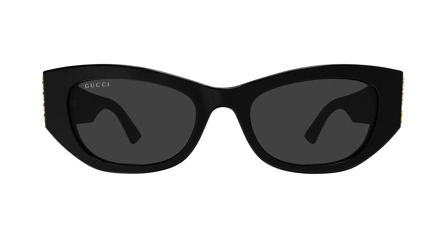 GG2044SA, Gucci'nin Lettering koleksiyonunun asetat cat-eye yorumu. Kalın parlak siyah asetat gövdenin feminen ve güçlü hacmi üzerinde şakakta dikey konumlanan altın metal 3D "GUCCI" harfleri — yukarıdan aşağıya okunan bu logo yerleşimi hem yan profilden hem önden güçlü bir kimlik sinyali verir.