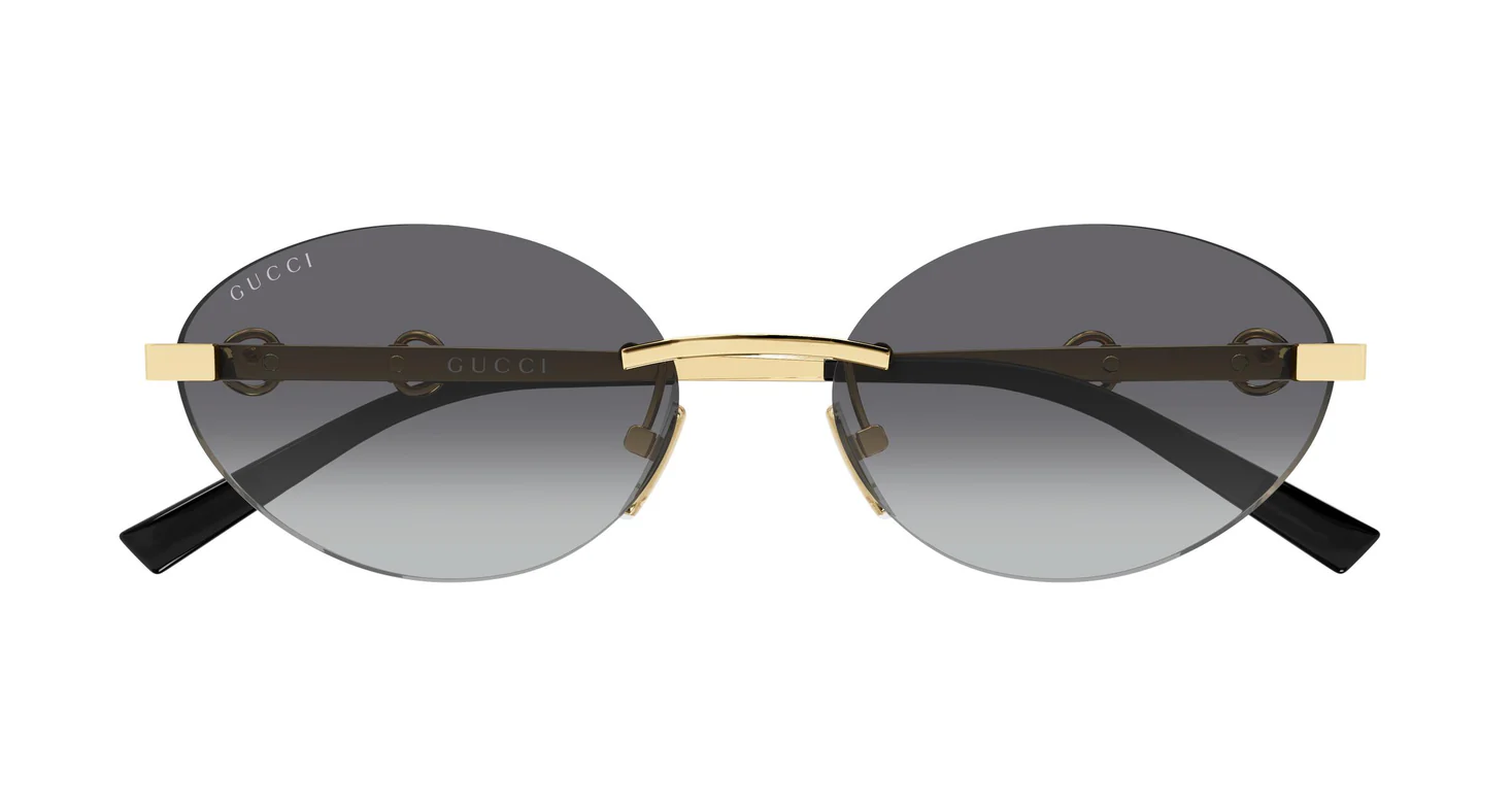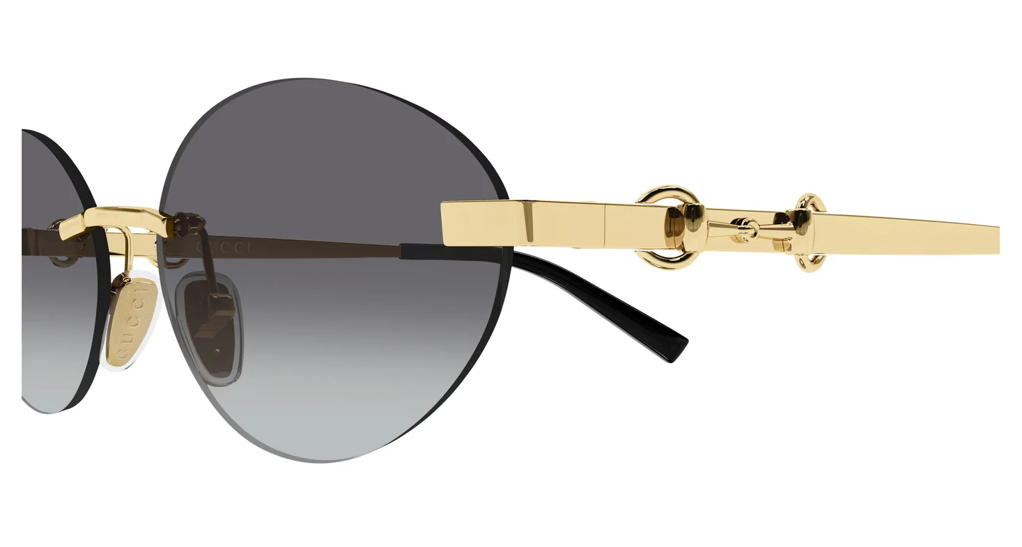 GG2051S 002, serinin en saf ve en monokrom altın versiyonu. 001'in altın metal + siyah asetat şakak kontrastına karşı 002 tamamen altın metal şakakla tam bir gold-on-gold bütünlük sunar — rimless oval lensin şeffaf hafifliği içinde Horsebit detayı ve tüm metal yüzeyler tek bir altın tonda buluşur.