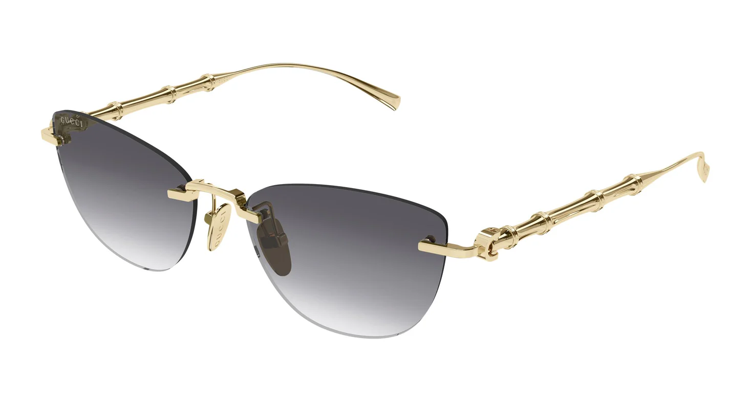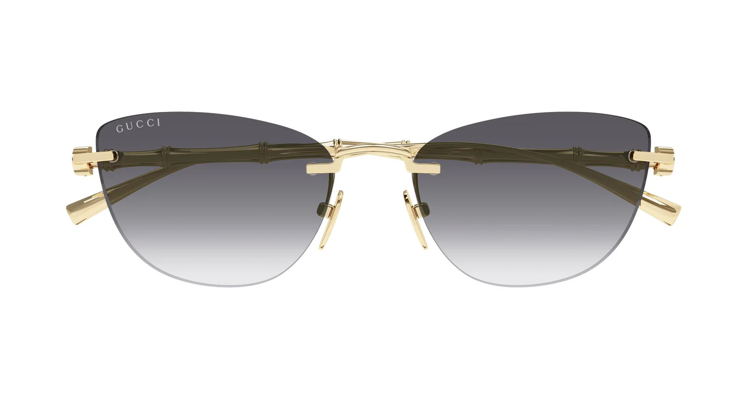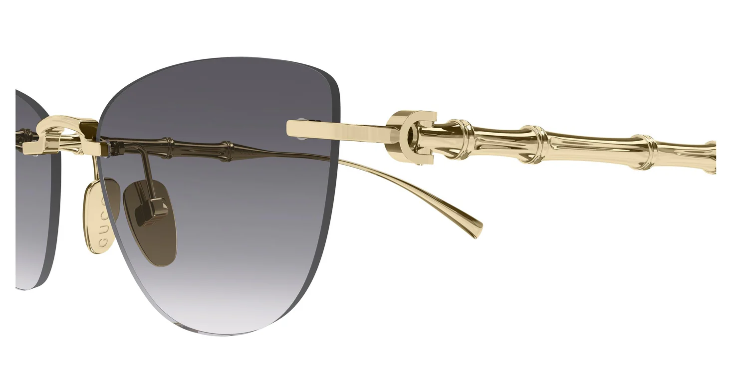 GG2063S, Gucci'nin 1947'den bu yana süregelen Bamboo mirasını eyewear'a taşır. Şakaklar boyunca uzanan bambu eklem dokulu altın metal ve menteşedeki GG interlocking logo — bu iki arşiv detayı rimless cat-eye formun şeffaf hafifliğiyle buluştuğunda sonuç Gucci'nin en çok katmanlı ve en anlatılı güneş gözlüğü tasarımlarından biri olur.