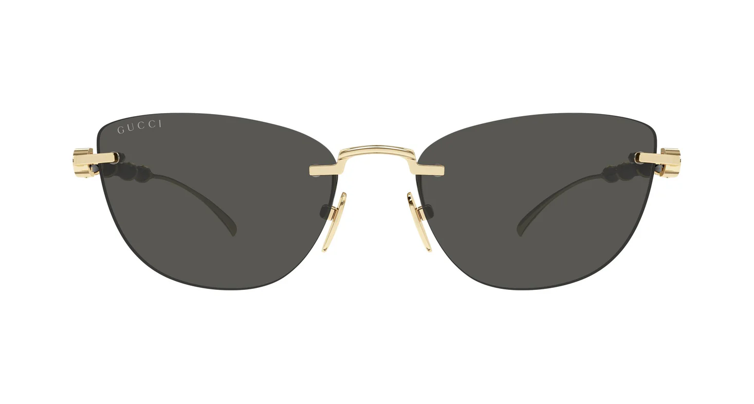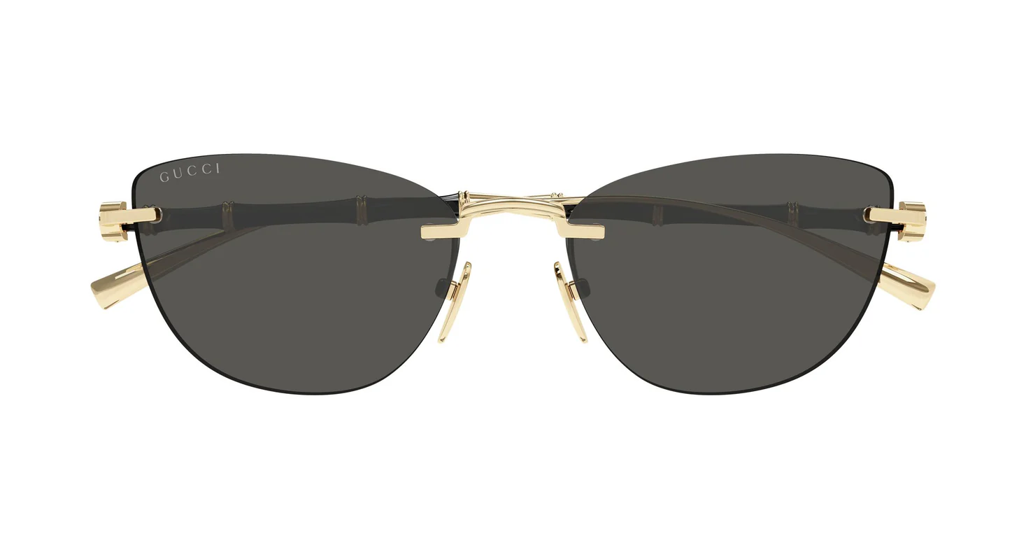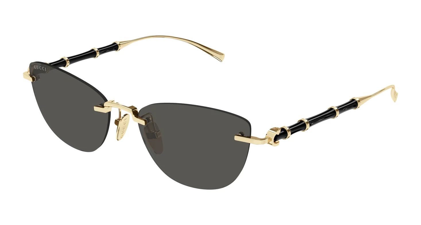 GG2063S 002, Bamboo koleksiyonunun en dramatik ve en kontrastlı versiyonu. 001'in tüm altın metal bambu şakağına karşı 002'de siyah bambu gövde + altın metal eklem halkaları kombinasyonu — siyah ve altının güçlü karşıtlığı şakaklara mücevher kalitesinde bir karakter kazandırır. Rimless cat-eye lensin şeffaf hafifliği bu detayı tam görünür kılar.