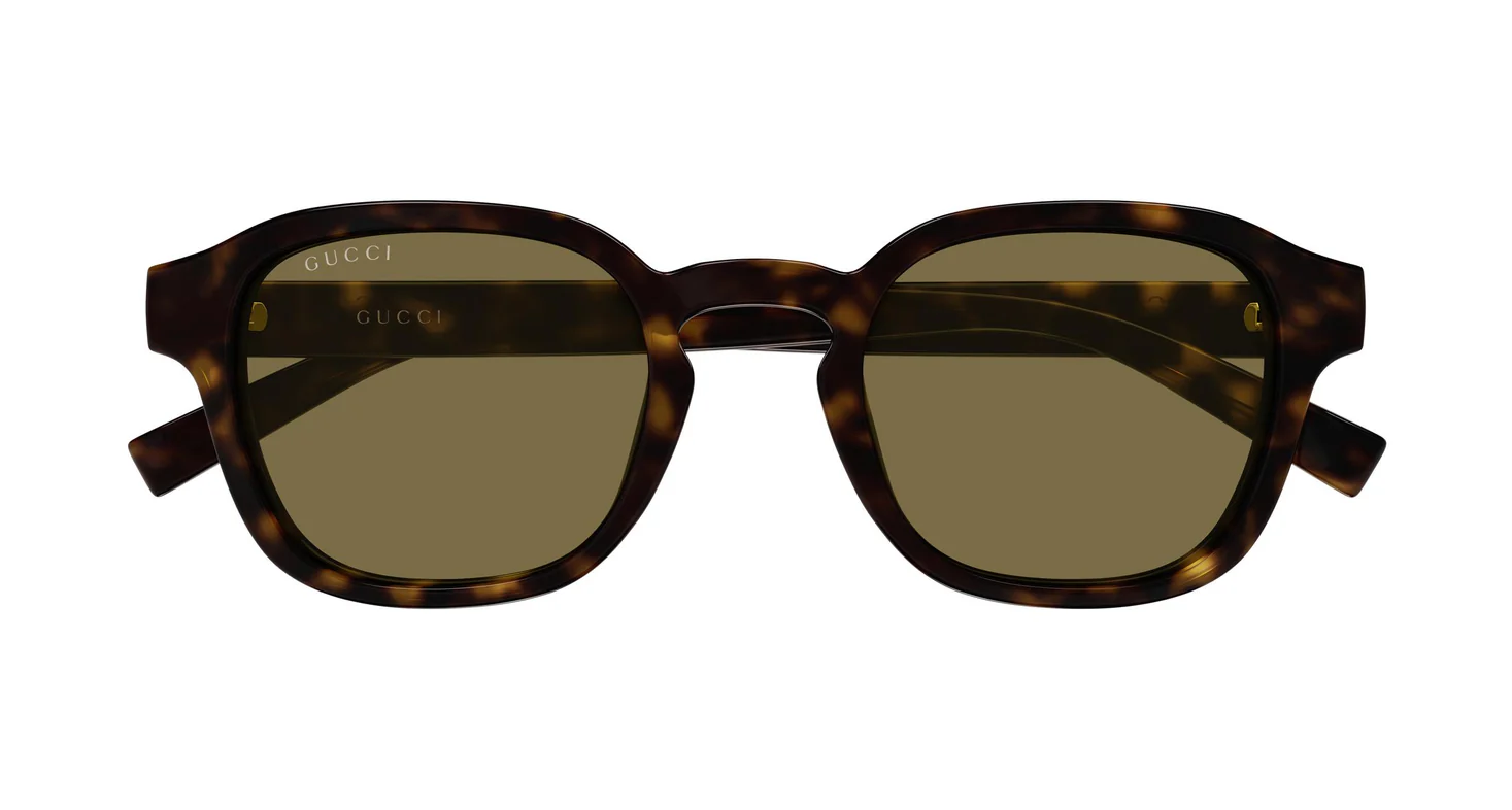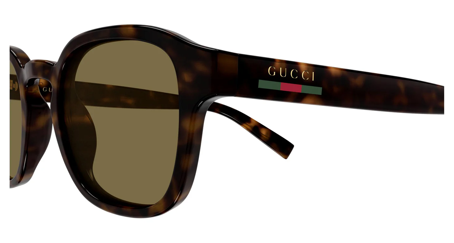 GG2106S, Gucci'nin 1951'den bu yana süregelen Web mirasını oversize maskülen bir formda buluşturur. Havana tortoise bio-enjeksiyon reçine gövde üzerinde şakakta altın "GUCCI" yazısı ve kırmızı-yeşil Web şerit — bu iki detay Gucci'nin atçılık kökenlerinden İtalyan renk paletine uzanan en tanınan arşiv sembollerini tek bir aksanda bir araya getirir.