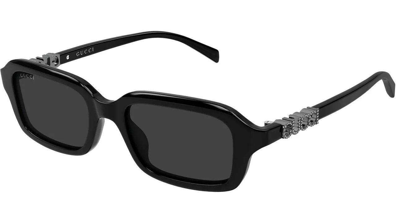 Gucci GG2152S 006: Name of Brand koleksiyonunun GG2152S modelinde 006 renk kodu koleksiyonun en kararlı ve en total-black ifadesini sunar. Parlak katı siyah recycled asetat dikdörtgen çerçevenin monolitik gücüyle her iki şakaktaki 3D tridimensional siyah/antrasit "GUCCI" harfleri aynı siyah palet içinde bütünleşir — harflerin varlığı renk kontrastı yerine yalnızca dokusal bir derinlik ve tridimensional bir hacim katarak modeli 001'in gümüş aksanlı yorumundan ayıran en saf "all black" versiyona dönüştürmektedir.