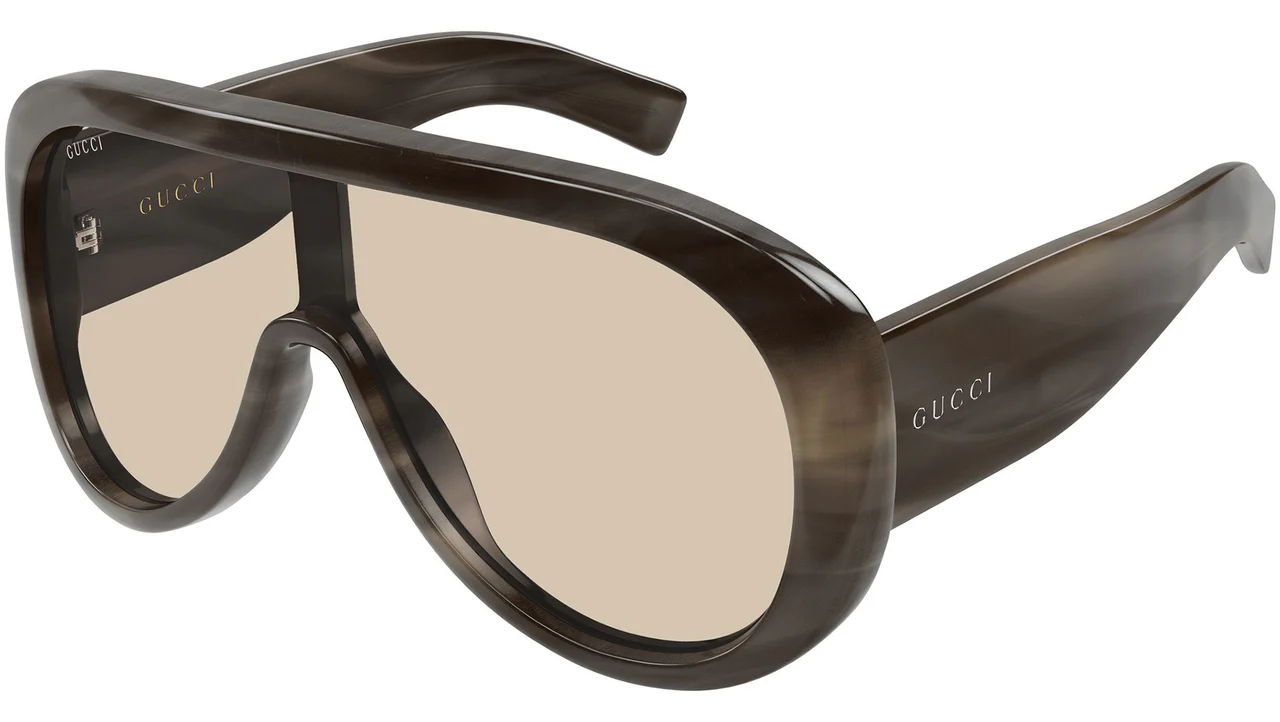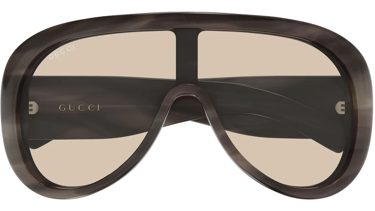 Gucci GG2164S 004: Gucci'nin sürdürülebilir lüks anlayışını ve retro-fütüristik tasarım vizyonunu yansıtan bu model, 004 renk koduyla alevli kahverengi havana deseninin sıcaklığını bej lenslerin sofistike tonuyla buluşturur. Klasik pilot (aviator) formunu devasa bir maske (shield) etkisiyle yeniden yorumlayan bu kadın güneş gözlüğü, "Institutional Logo" koleksiyonunun en iddialı parçalarından biridir. Yüzü panoramik bir şekilde saran yapısı, Gucci'nin maksimalist estetik anlayışını temsil eder. Teknik Tasarım ve Ölçüler