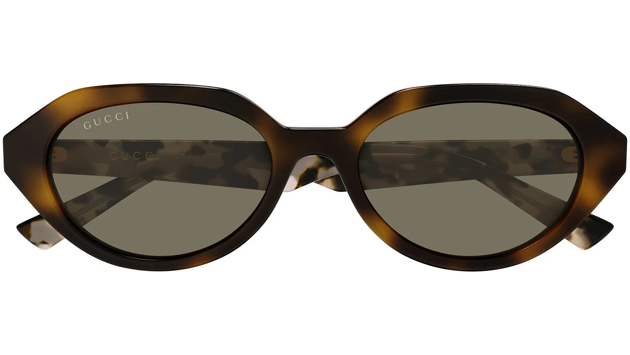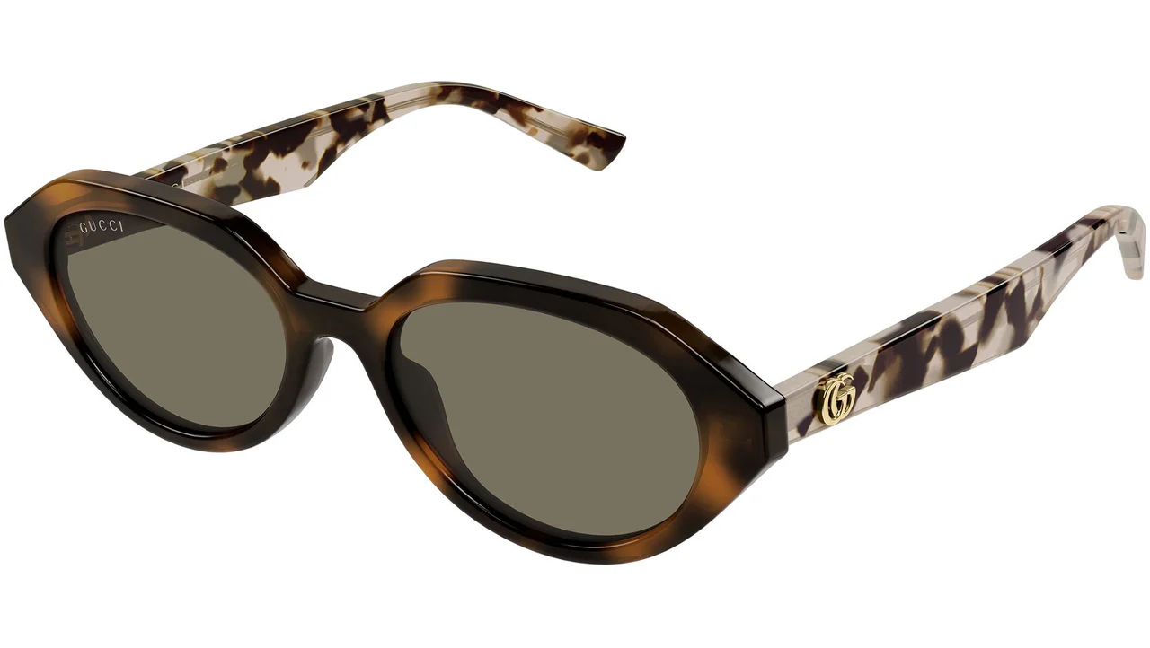 GG2178S 004'ü özel kılan nedir? Ön ve şakağın farklı iki tortoise deseni taşıması — koyu havana ve krem/beyaz — tek bir çerçevede iki farklı malzeme kimliğini buluşturur; bu iki tonluluk Gucci Emblem koleksiyonunun en cesur ve en özgün renk yorumudur.