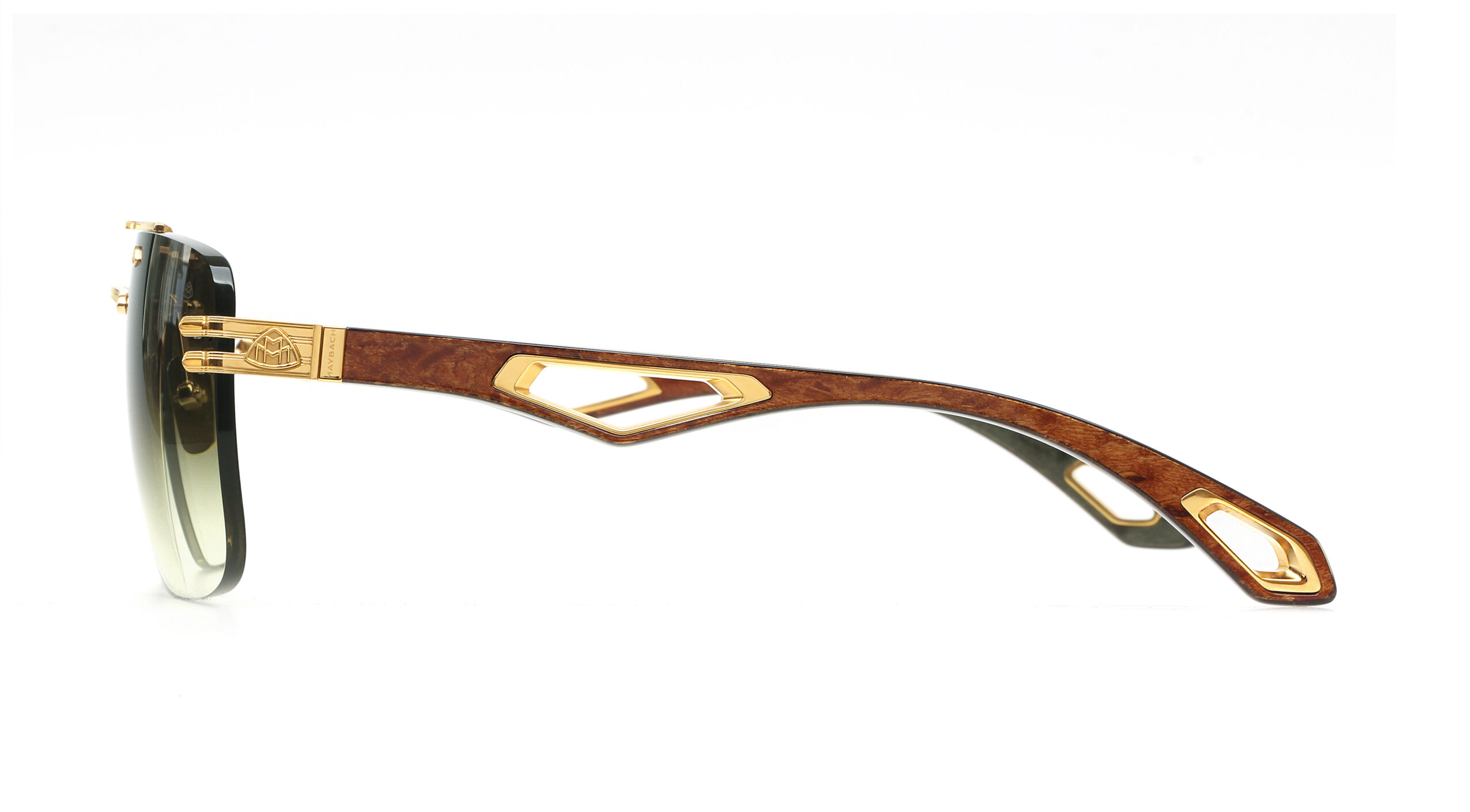 Maybach The President I G-WCY-M13: Almanya'nın efsanevi otomobil mirasından ilham alan Maybach Eyewear'ın The President I modeli, çerçevesiz (rimless) navigator silüetiyle ve otomobil tasarım dilinden ilham alan dinamik kesimler barındıran el yapımı ahşap şakaklarıyla güç, otorite ve el işçiliğinin zirvesini temsil eden bir başyapıttır. G-WCY-M13 kombinasyonu, altın kaplama titanyum ve Karelian Huş/Forrest Green BEM ahşabını benzersiz bir armoni içinde bir araya getirir.
