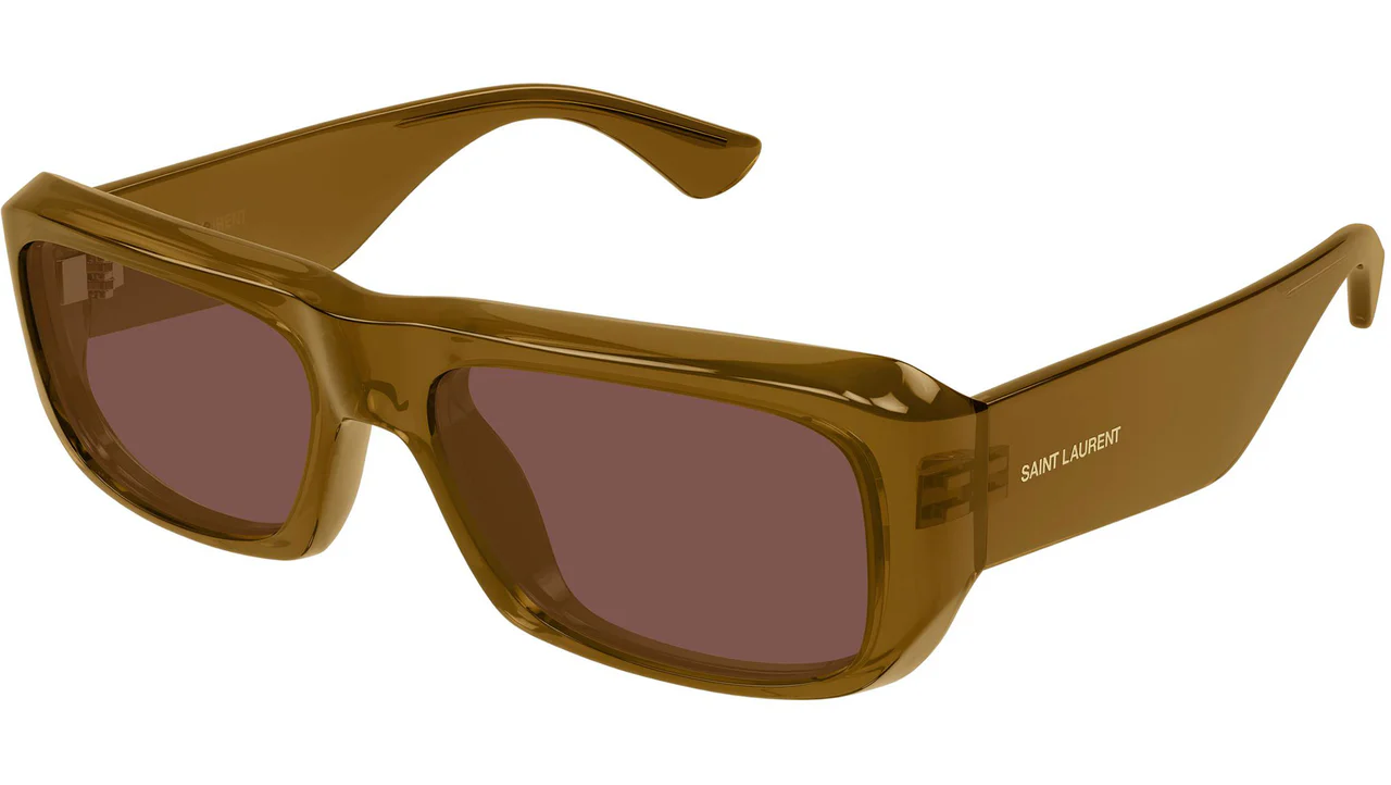 Teknik Tasarım ve Ölçüler SL 869, kalın bio-enjeksiyon reçine gövdesiyle maskülen ve grafik bir dikdörtgen siluet sunar. 57 mm geniş cam alanı, 17 mm köprü ve 135 mm şakak uzunluğuyla orta yüz yapılarına mükemmel oturur; 135 mm kompakt şakak uzunluğu modele güçlü ve sıkı bir oturum sağlar. Şeffaf cognac bio-enjeksiyon reçinenin yarı saydam yapısı ışığı içinden geçirerek çerçeveye canlı ve organik bir optik derinlik katar. Şakaklardaki altın "SAINT LAURENT" logosu modeli anında tanınır kılan imza detaydır. İtalya'da Kering Group atölyelerinde üretilmektedir.