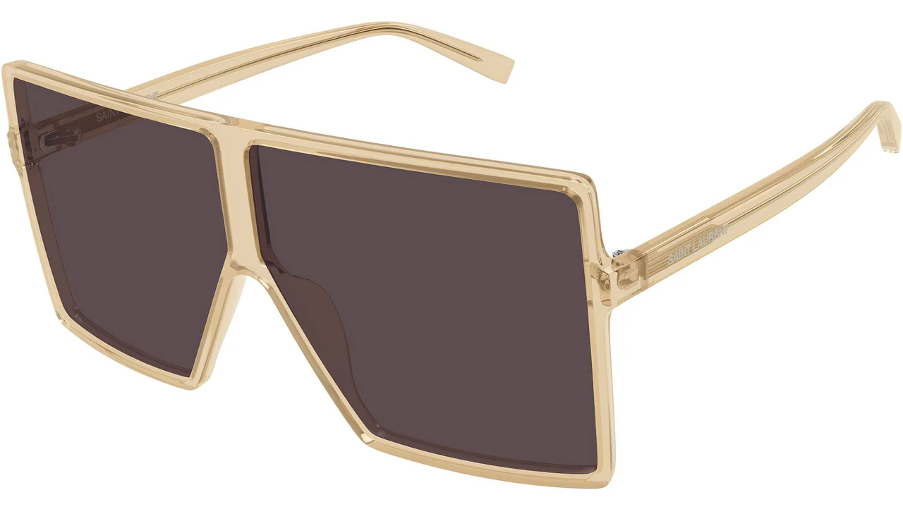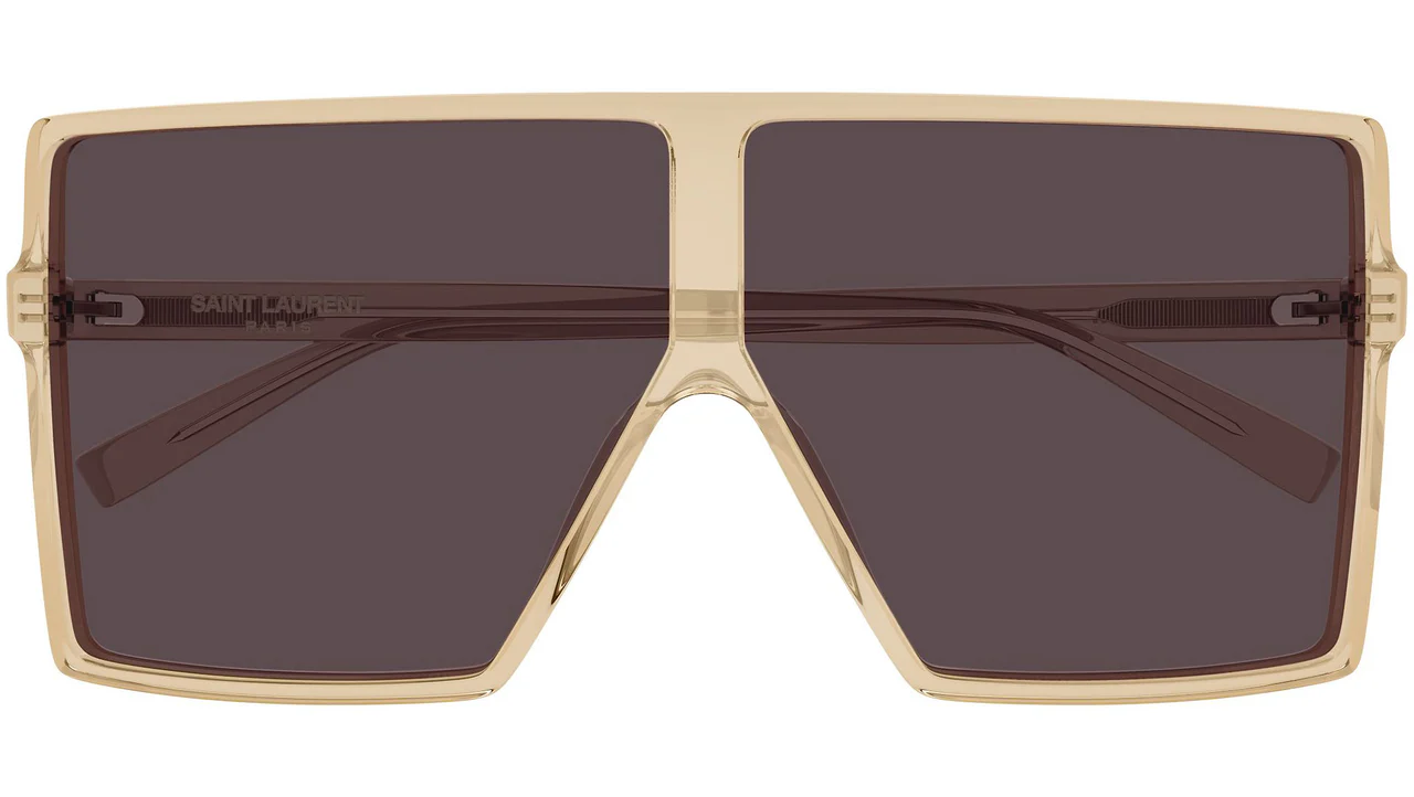 Teknik Tasarım ve Ölçüler SL 909 BETTY S, flat-top (düz üst kenar) oversize mask formun güçlü ve sinematik silüetiyle Saint Laurent'in en dramatik güneş gözlüğü ifadelerinden birini sunar. 63 mm geniş cam alanı yüzün büyük bölümünü örterek maksimum kaplama ve dramatik bir örtünme etkisi yaratır; 16 mm köprü ve 145 mm şakak uzunluğuyla orta ve geniş yüz yapılarına mükemmel oturur. Şeffaf sarı asetatın yarı saydam yapısı ışığı içinden geçirerek çerçeveye maddesizleşmiş bir optik kalite katar. Şakaklardaki Saint Laurent logosu modeli anında tanınır kılan imza detaydır. Japonya'da üretilmektedir.