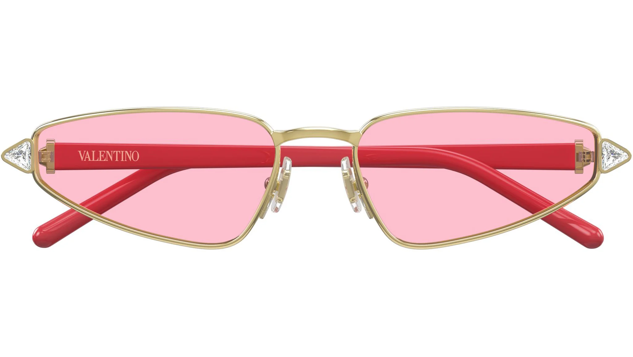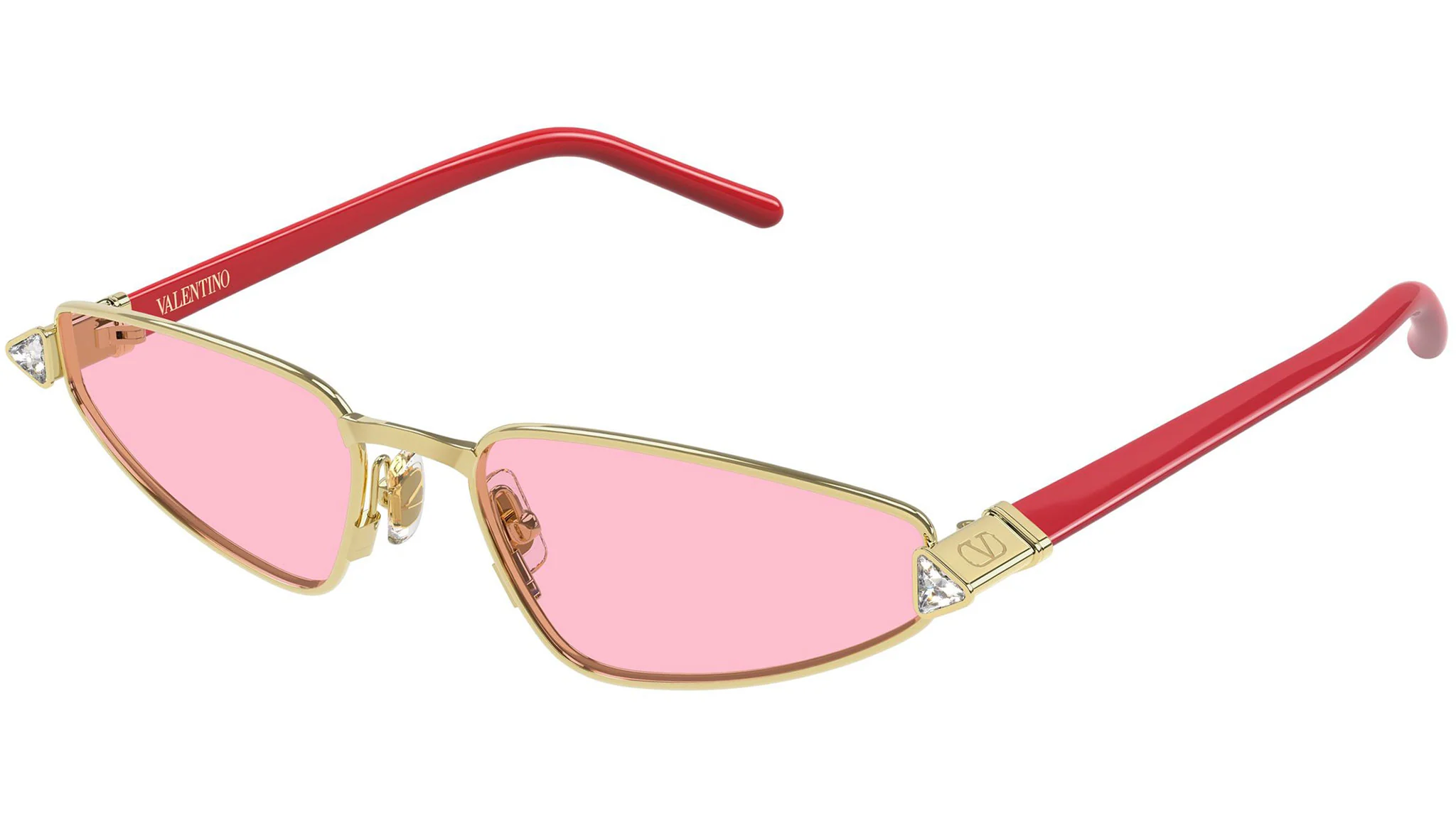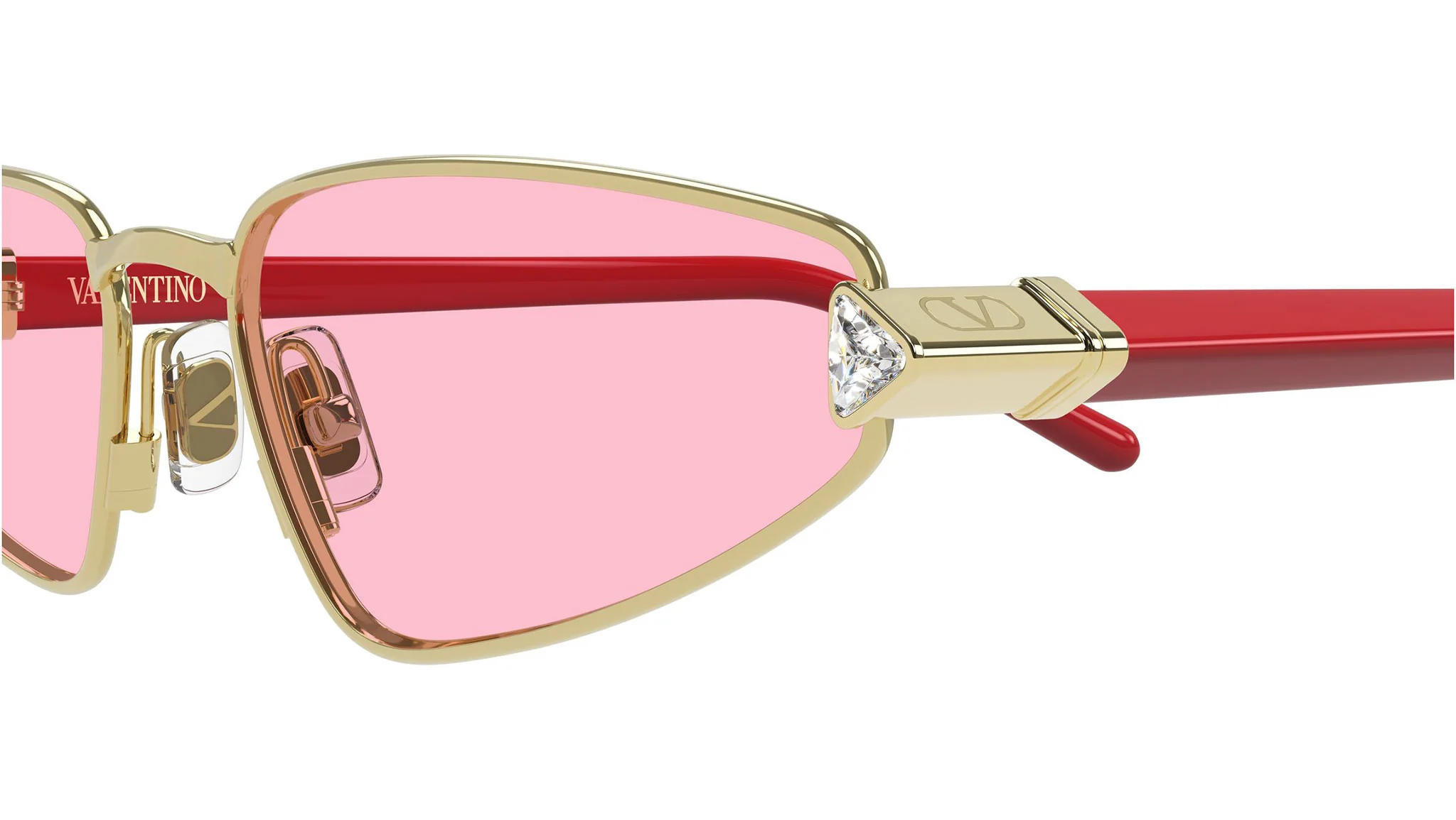 Valentino VG0035S 002: Roma'nın couture mirasından ilham alan Valentino, V Logo koleksiyonunun VG0035S modelinde endura altın metalin rafine parlaklığını cat-eye formun feminen yukarı çekişiyle buluşturur. 002 kombinasyonunda altının ısıl ve asil tonu ile açık pembenin romantik ve naif hafifliği bir araya geldiğinde Valentino koleksiyonunun en feminen ve en couture ifadesi ortaya çıkmaktadır — VG0032S'nin rimless oval yorumunun bu kez cat-eye formda kardeş modeli.